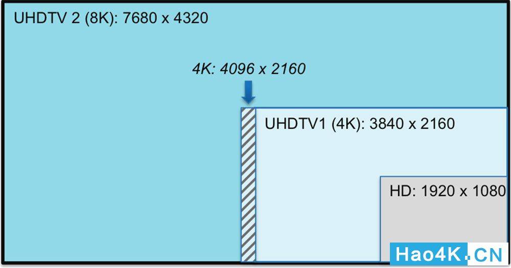 4K分辨率是指水平方向每行像素值达到或者接近4096个,不考虑画幅比。而根据使用范围的不同,4K分辨率也有各种各样的衍生分辨率,例如Full Aperture 4K的4096×3112、Academy 4K的3656×2664以及UHDTV标准的3840×2160等,都属于4K分辨率的范畴。